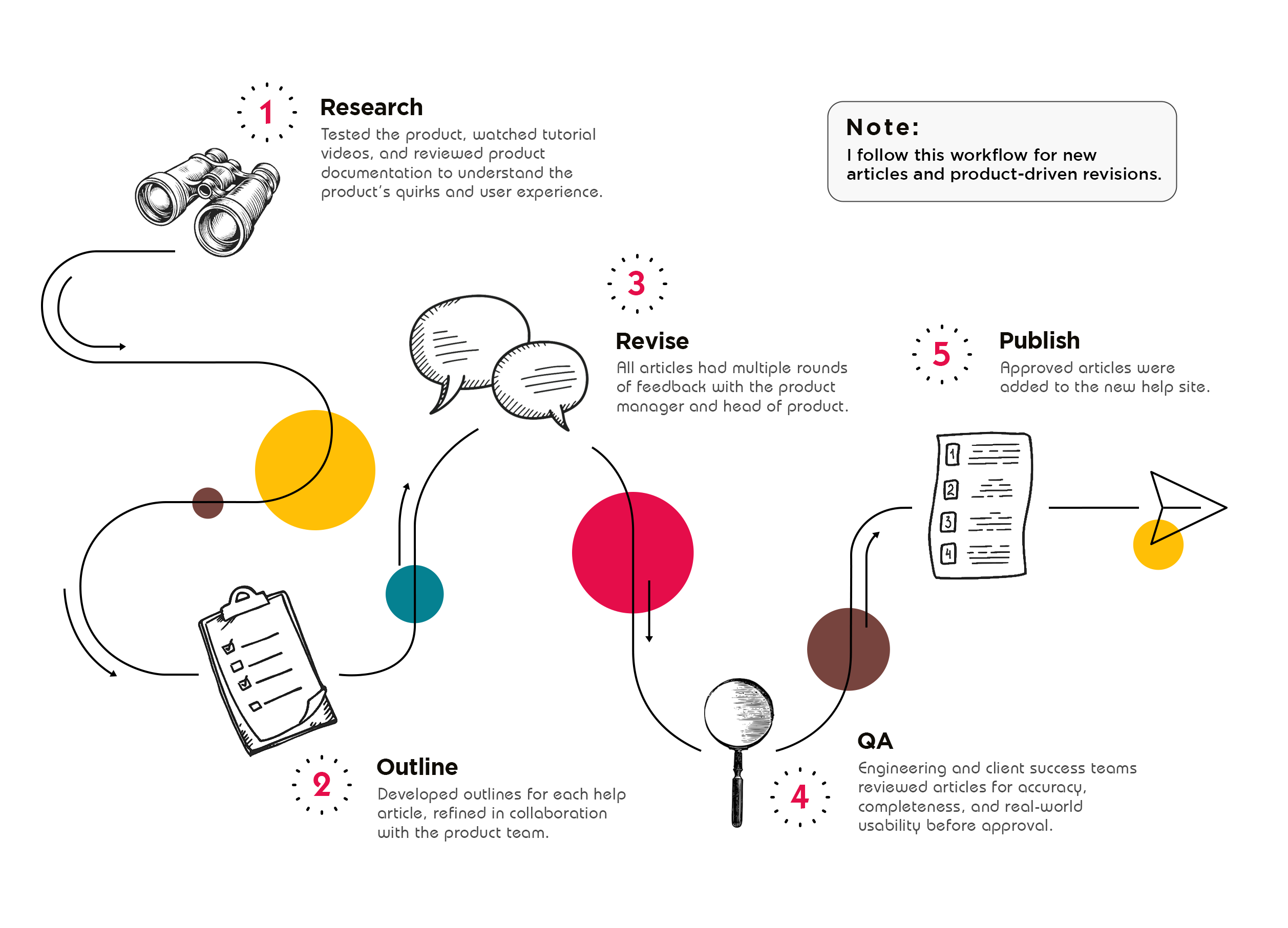 Article development began with research, which formed the basis for outlines I submitted to the Product team for review. Once an outline was approved, I would draft the full article and revise it based on the product manager’s feedback (both written and video) until it was ready for QA and upload to the help site.